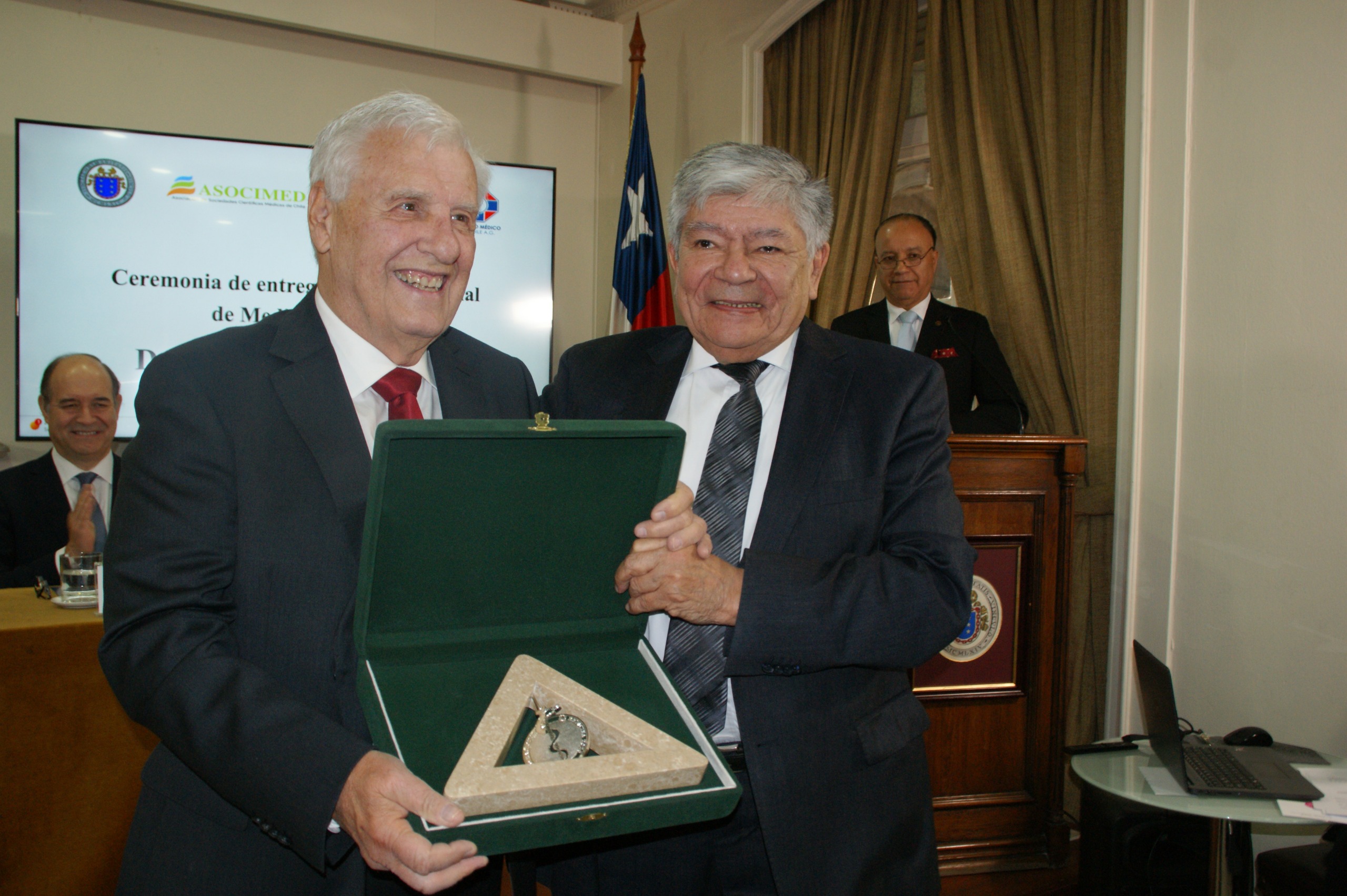 Dr. Antonio Orellana, Presidente de ASOFAMECH, le entrega una medalla conmemorativa al Dr. Attila Csendes.