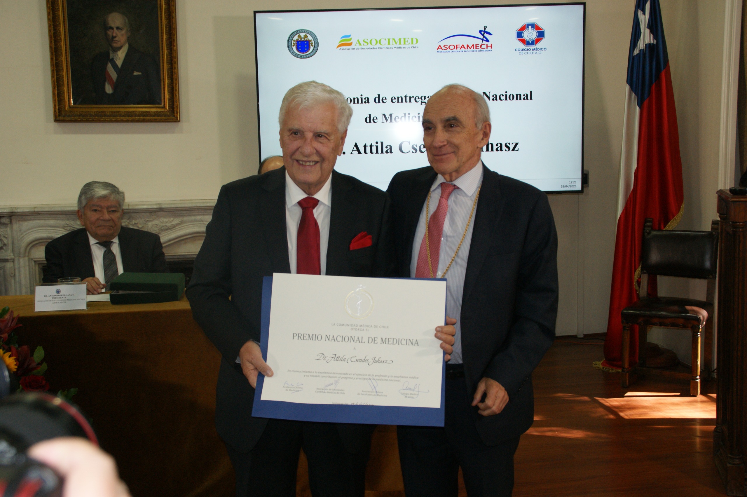 Dr. Attila Csendes recibe el diploma que acredita la obtención del Premio Nacional de Medicina 2026, de manos del Dr. Fernando Cassorla, Presidente de la Academia Chilena de Medicina.